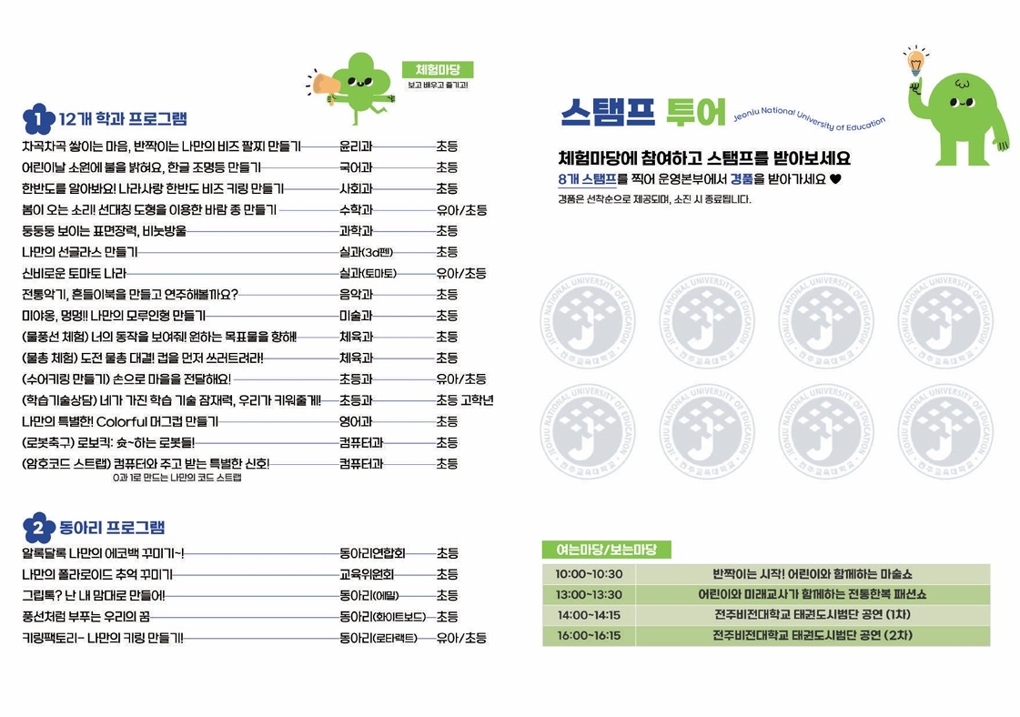 전주교대 학생들이 직접 프로그램을 기획하고, 운영하는 만큼 퀄러티가 매우 훌륭하고 알찬 프로그램이 많습니다.